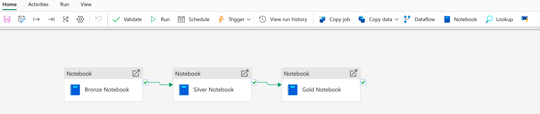 - Notebook Task Chaining: The pipeline comprised three chained Notebook tasks (Bronze $\rightarrow$ Silver $\rightarrow$ Gold), linked using the “On Success” dependency to ensure they run sequentially,.