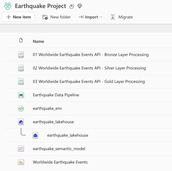 I have successfully designed and implemented a robust, automated data engineering and analysis project leveraging the full capabilities of Microsoft Fabric, focusing on worldwide earthquake events data. This project followed the Medallion Architecture pattern, ensuring the data’s structure and quality improved incrementally across three distinct layers: Bronze, Silver, and Gold.