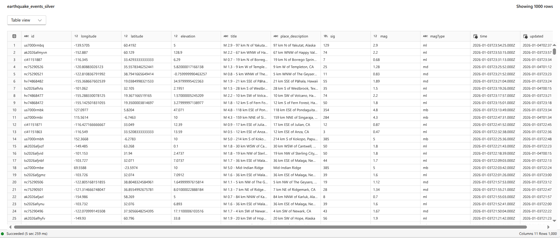 earthquake_events_gold, making it the definitive source for BI reporting. In the final implementation, the notebook included logic to filter the Silver table for records occurring after the receivedstart_dateparameter to prevent reprocessing duplicate data during subsequent runs.