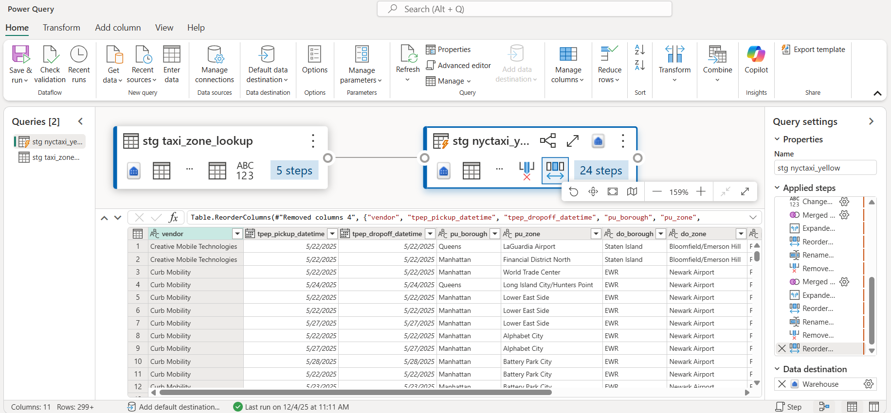 In this Dataflow, the focus is on cleaning, enriching, and standardizing the raw trip data before loading it into the presentation table dbo.nyctaxi_yellow.