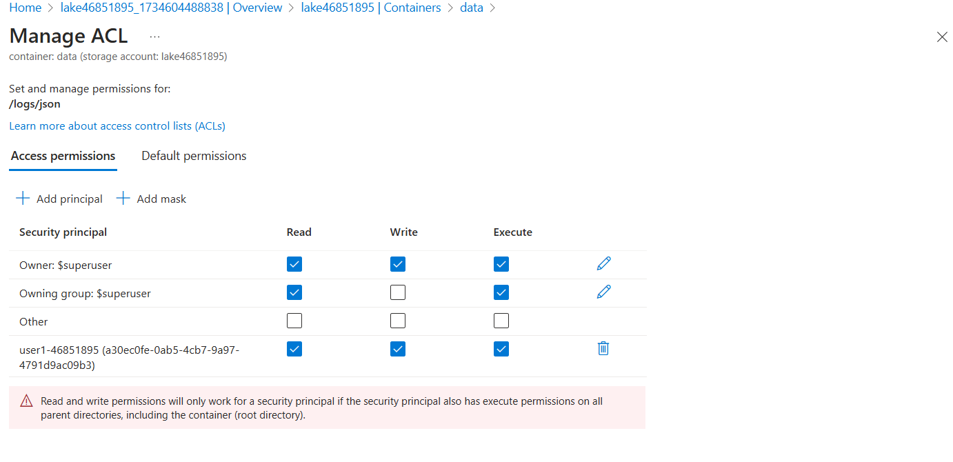 ACL permissions do not support inheritance, so you will have to set execute permissions on all parent directories, including the container—the root directory. You will also need to set read permissions so that the user can display the directory structure of the container in the Azure portal for testing.