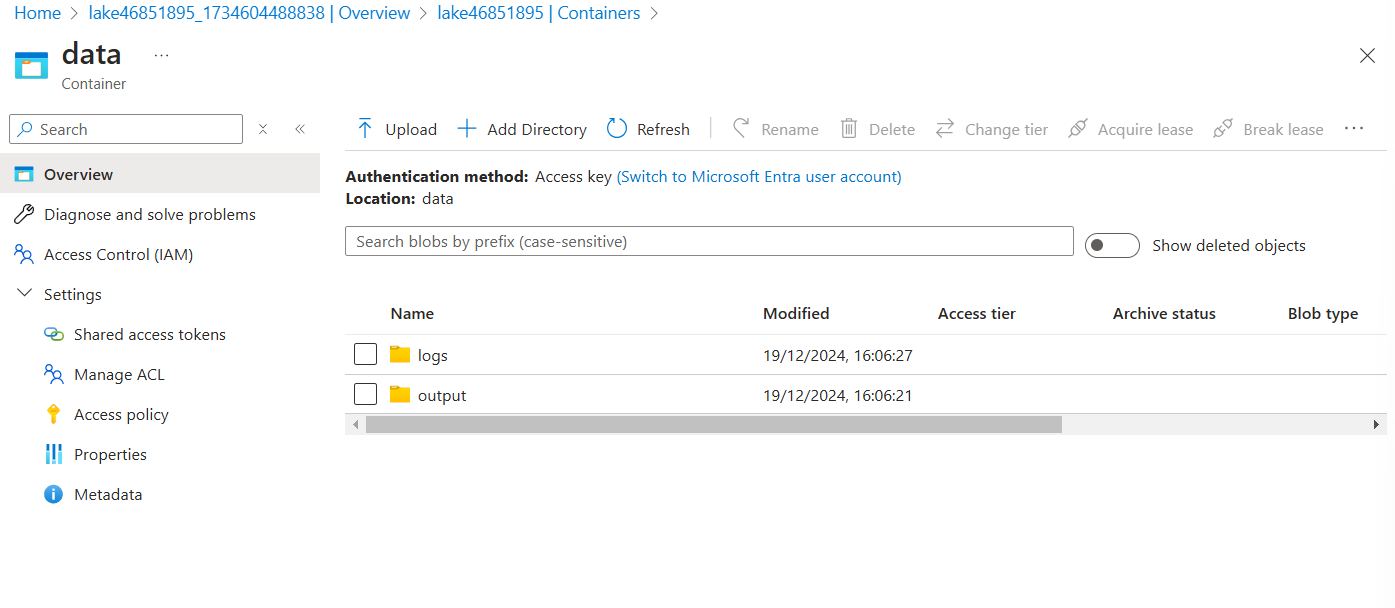 Now, assign the ACL permissions to the container “data” by clicking on manage ACL on the left settings