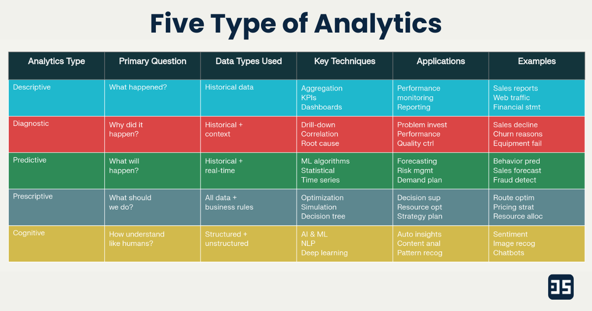 The five types of analytics represent complementary approaches that, when combined strategically, create powerful capabilities for data-driven decision-making.